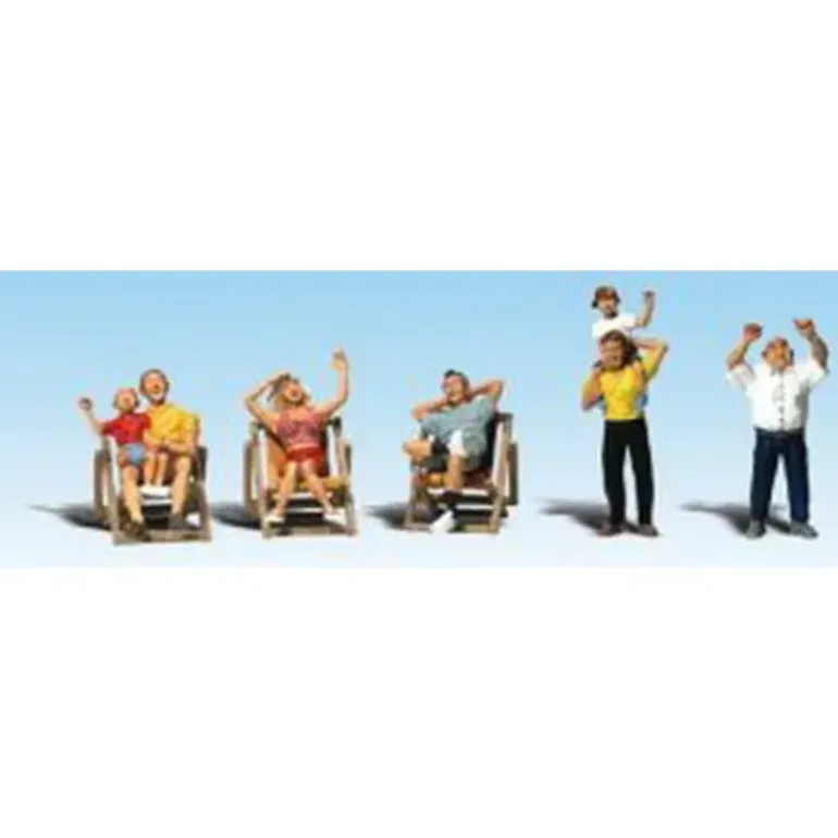 This is a Woodland Scenics A1881 HO Scenic Accents Spectator Figures (Set of 8). A set of seven people – two children, one woman and four men – who could be watching any sporting event, parade or maybe a concert. One man sits with a small cheering child and another man sits relaxing, with legs crossed and hands bhind his head. The woman blocks the sun from her eyes, another man holds a child on his shoulders and the fourth man raises both arms, cheering.