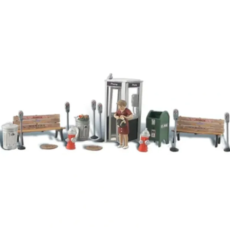 This is a Woodland Scenics A1941 HO Scenic Accents Street Accessories (Set of 18 pieces set includes six parking meters, watchful meter-maid, manhole covers, fire hydrants, trash cans, resting benches, street corner mailbox and a vintage folding-door telephone booth.