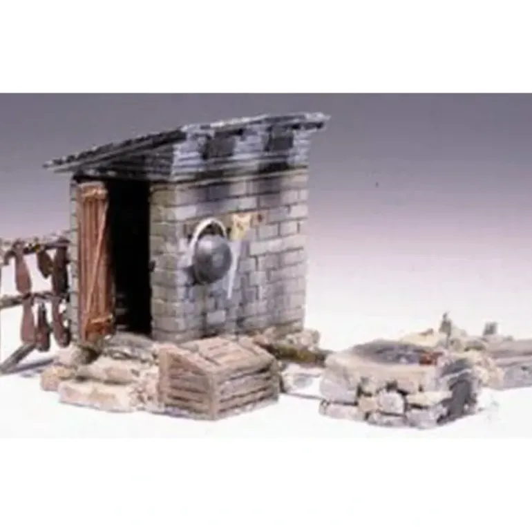 You can add this smokehouse anywhere on your layout. It includes smoked hams hanging on a fence, an old saw and bucket, plus stone and lumber piles.
