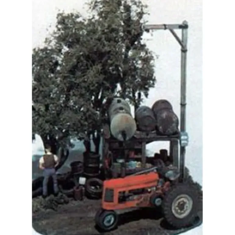 After a long day of plowing, Farmer Fred finds the closest treefast. Includes tractor, farmer, gas tanks, tractor parts, oilcans, drums, trees, foliage, base and assorted pieces.